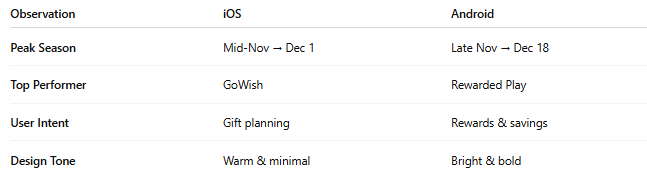 π‘ Takeaway: Emotion-led, minimalist holiday visuals perform best on iOS.