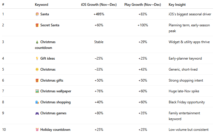 iOS users search emotionally (βSecret Santaβ, βGift ideasβ), while Android users prefer functional terms (βCountdownβ, βWallpaperβ).