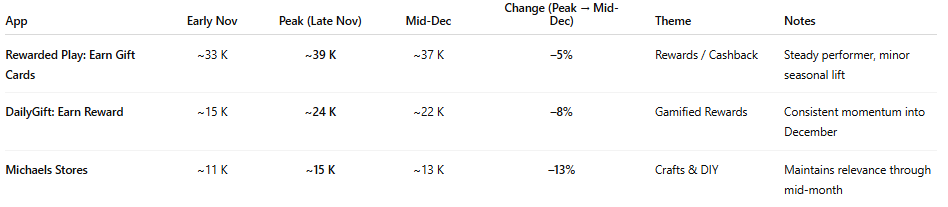 Downloads fell by 45β60% by mid-December as gift lists and office events were finalized.