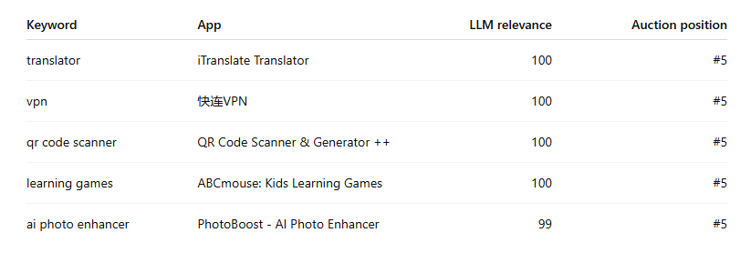 Look for cases where an app is one of the most semantically relevant results for a keyword but still sits low in the auction stack. Those are usually the best opportunities for exact-match isolation, bid increases, and budget protection. In this dataset, terms like “translator,” “vpn,” and “ai photo enhancer” showed clear examples of that pattern.What is the simplest takeaway from this analysis?