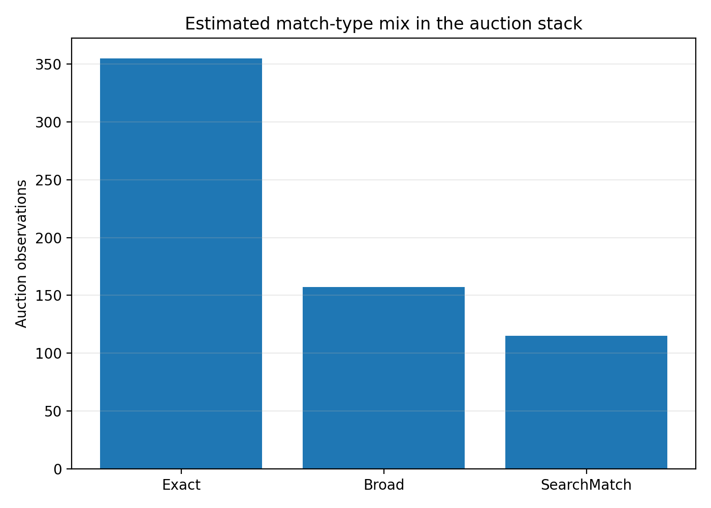 That is an important result. The auction is not mostly junk. Most ads in the stack still look strongly relevant. But nearly one in five observations look like Search Match-style loose expansion, which is enough to create major noise, distort CPCs, and generate very odd competitive sets.