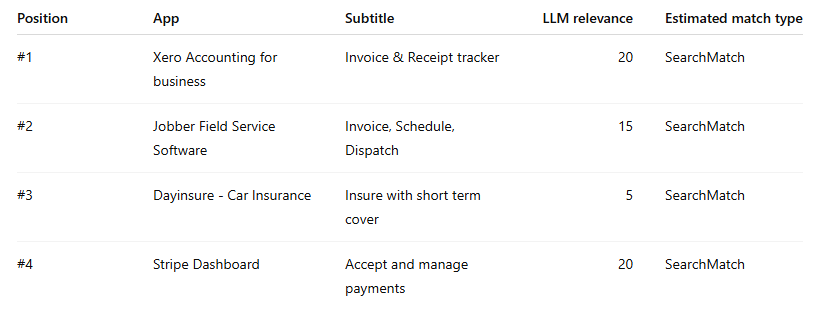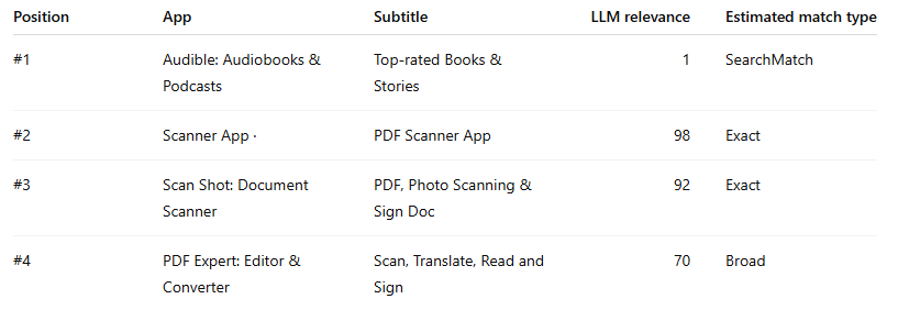 Partly, but not cleanly. Semantic relevance appears to matter most at the eligibility stage, especially for exact match. After that, the final order looks much more influenced by commercial factors like bid strength and expected tap-through or conversion performance. That is why highly relevant apps can still end up in positions #4 or #5, while weaker fits sometimes sit at #1.What is the difference between exact match, broad match, and Search Match in practice?