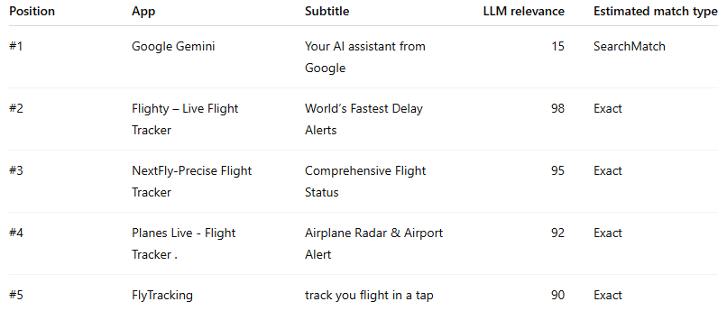 If the auction were relevance-led, the top four positions would almost certainly be some permutation of the four actual flight-tracking apps. Instead, Gemini takes slot #1 despite being the least relevant app in the stack by a huge margin.