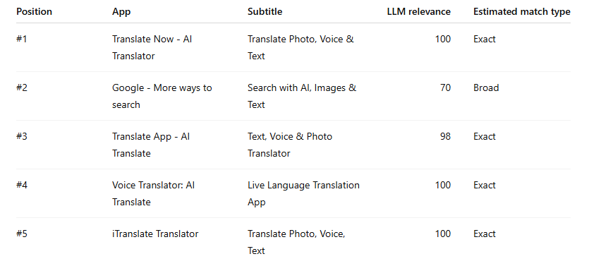 The striking point is not #1 - that’s perfectly reasonable. The striking point is that iTranslate, a direct semantic match, is sitting in #5 despite also scoring 100.
