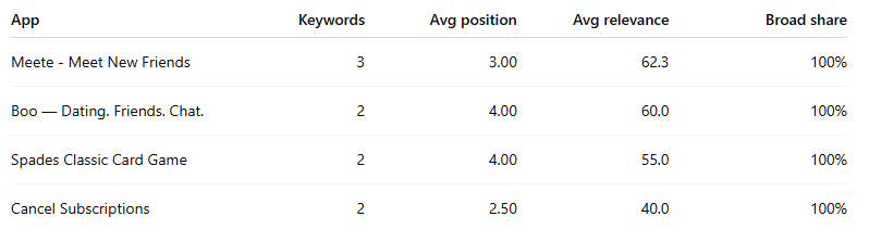 This is the clearest “strategy fingerprint” in the dataset. These apps are not simply showing for one or two adjacent keywords. They are showing across broad keyword sets with relatively weak semantic fit. That is what large-scale Search Match usage looks like.