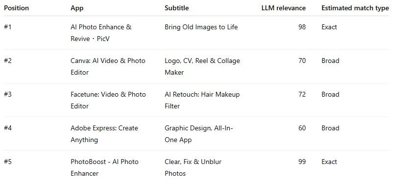 This stack is fascinating because the #5 app is actually the highest-scoring semantic match in the whole set. If you are the manager of PhotoBoost, this is not a metadata problem. It is a commercial problem.