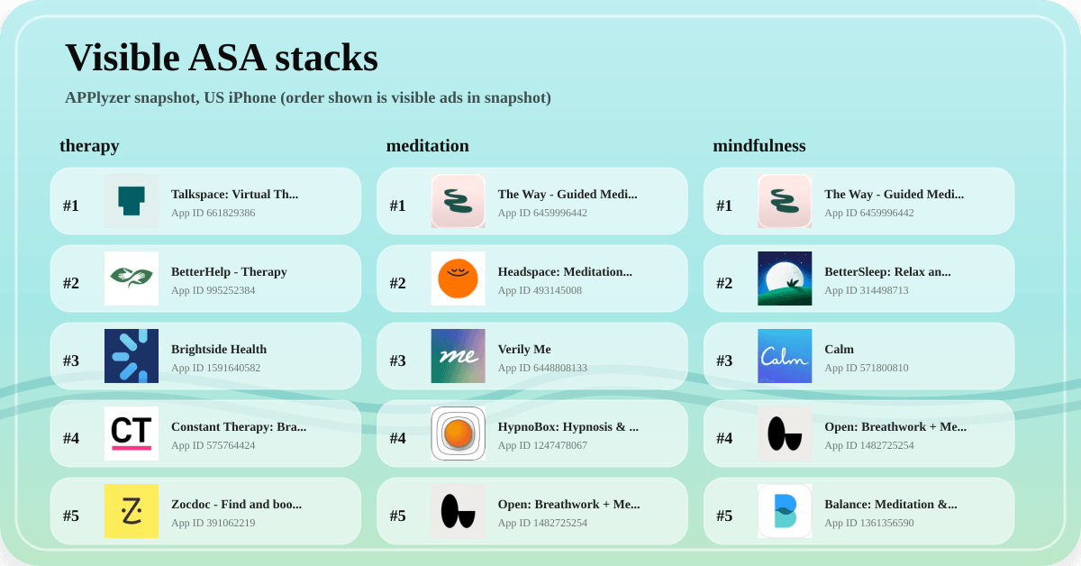 Its Apple Search Ads snapshots showed 5 visible ads on each of the nine tracked keywords in this analysis, including mental health, therapy, mindfulness, meditation, anxiety, depression, calm, and headspace.