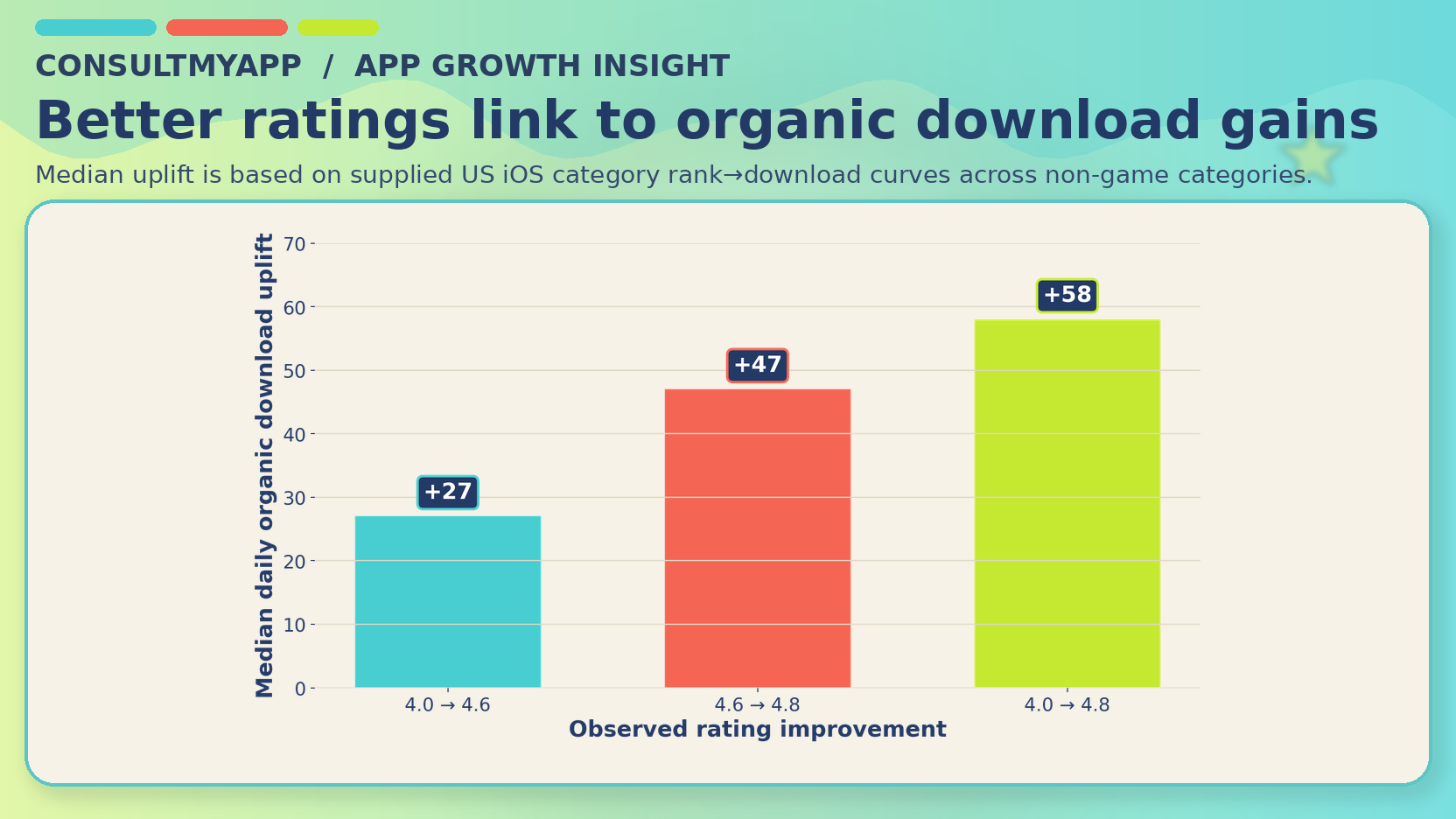 Across the core non-game categories, the median daily uplift looks like this: 4.0★ → 4.6★: +22 daily organic downloads; 4.6★ → 4.8★: +57; 4.0★ → 4.8★: +72.