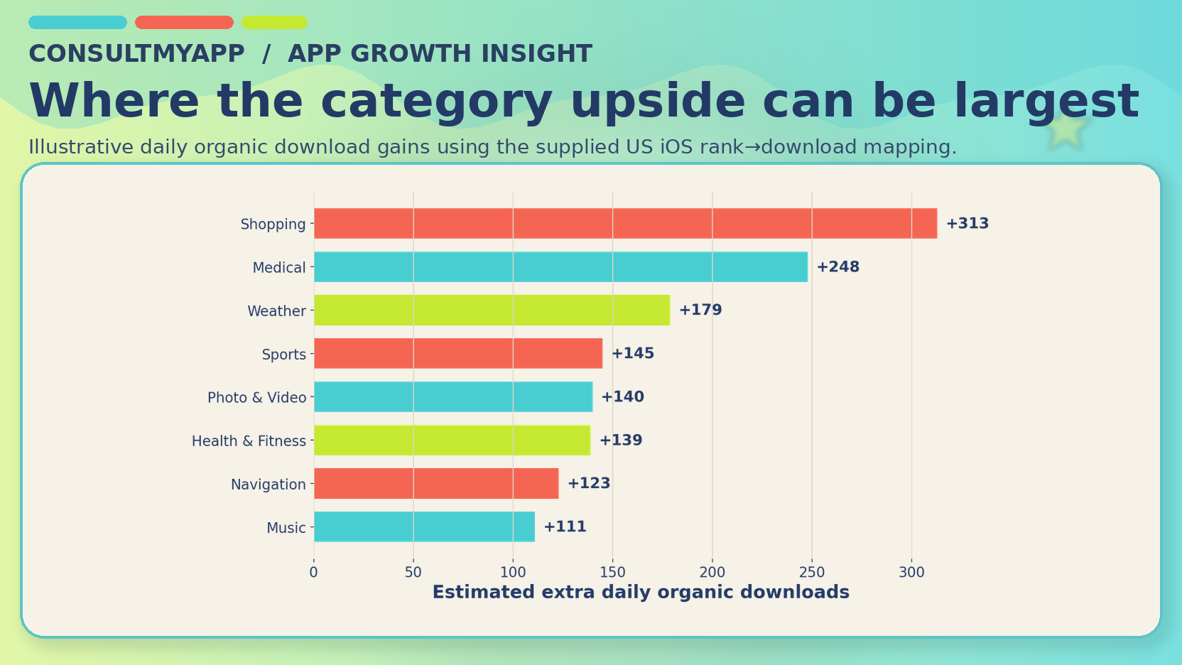 The exact value varies by category, and some category curves are noisier than others, but the direction is usually positive. In several categories the upside is particularly meaningful: Shopping +313, Medical +248, Weather +179, Sports +145, and Photo & Video +140.