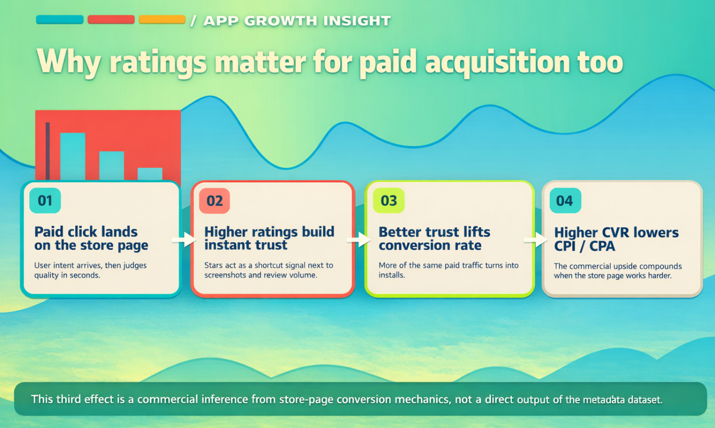It is associated with materially better category rank, materially more organic downloads and a stronger conversion environment for paid traffic. That is a rare combination. Most levers improve one part of the funnel. Ratings can improve three.