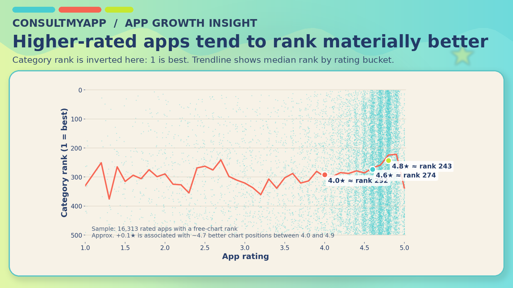 That is why the best way to describe app rating is not as a silver bullet. It is closer to a qualifying condition. A low-rated app can still exist in the charts, but the very highest positions are overwhelmingly populated by apps users already trust.
